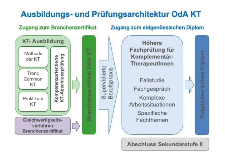 Der Weg zum Diplom ist 2-stufig: Zuerst wird das Branchenzertifikat OdA KT erlangt. Das eidgenössische Diplom wird erst später erteilt – nach nachgewiesener 2-jähriger Berufspraxis und Supervision sowie bestandener Höherer Fachprüfung.